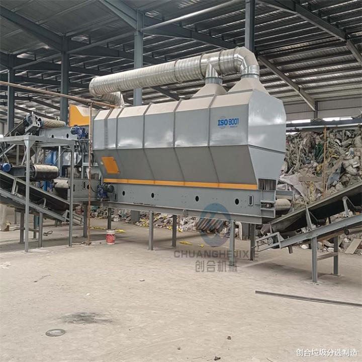 风力分选设备风力分选又称气流分选,是利用物料在气流中沉降速度的差异进行分选的方法。该设备通常由进料口、风机、沉降室、集料斗等部分组成。当混合垃圾进入风力分选设备后,在气流的作用下,较轻的物料(如塑料薄膜、纸张等)会被吹到较远的地方落下,而较重的物料(如石块、金属块等)则会落在较近的地方。风力分选设备结构简单、成本较低,适用于轻质物料与重质物料的分离,常用于生活垃圾预处理中的粗分选环节。